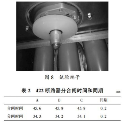 本次試驗選取422斷路器進行機械特性檢驗,按圖6進行試驗接線。將4221隔絕開關置于接地方位,將試驗端子接到柜內電纜接口,然后將試驗線接到試驗端子下端進行試驗。試驗端子如圖8所示。422斷路器分合閘時刻和同期見表2