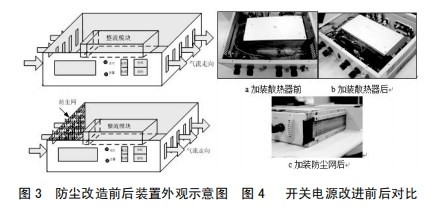 3.2在裝置本體進風孔加防塵網,避免塵埃進入裝置內部,設備保護人員定時對濾網中止清掃,然后減輕元器件表面覆塵,利于裝置正常散熱,如圖3所示加裝防塵網后開關電源表明圖。對裝置實施上述改進后,其改進前后對比如圖4所示。