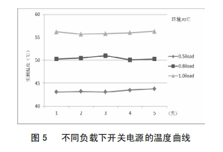改進后,為考證改進效果,對開關電源分別在0.5倍、0.8倍及1.0倍負載下中止了為期5天的帶負荷實驗,圖5為不同負載下開關電源的溫度曲線,由圖5可知,跟著負荷的增大,開關電源問題全體呈上升趨向;負載不變的狀況下,同一溫度曲線底子堅持滑潤;開關電源在額定負載下作業,最高溫度不超越57℃,未達報警值,開關電源可靠性得到明顯前進。